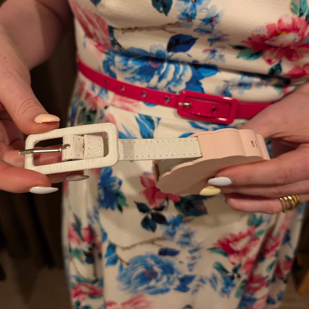 The base has two small holes on one side to allow a ribbon to be fed through so you can hang your belt reel with its corresponding dress.